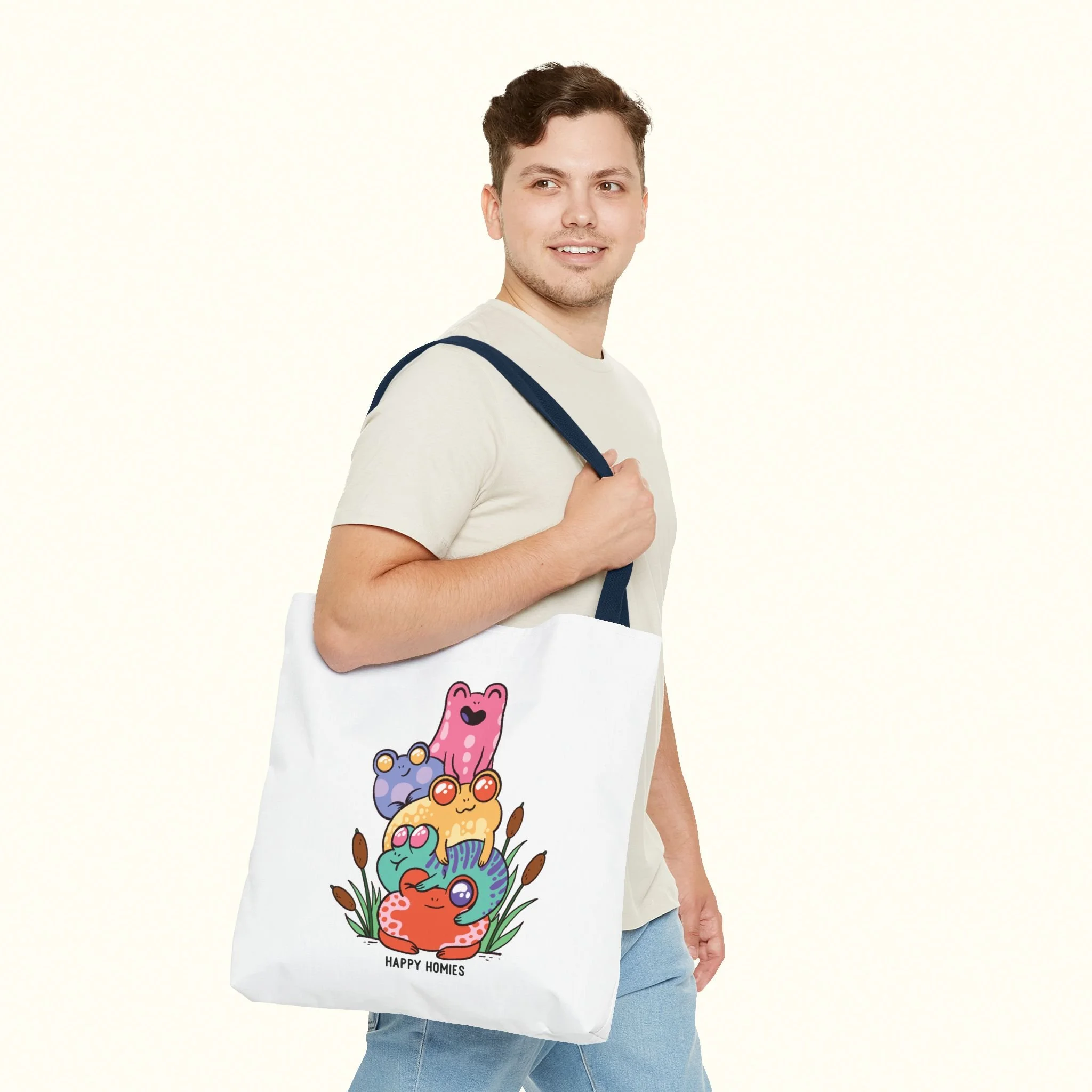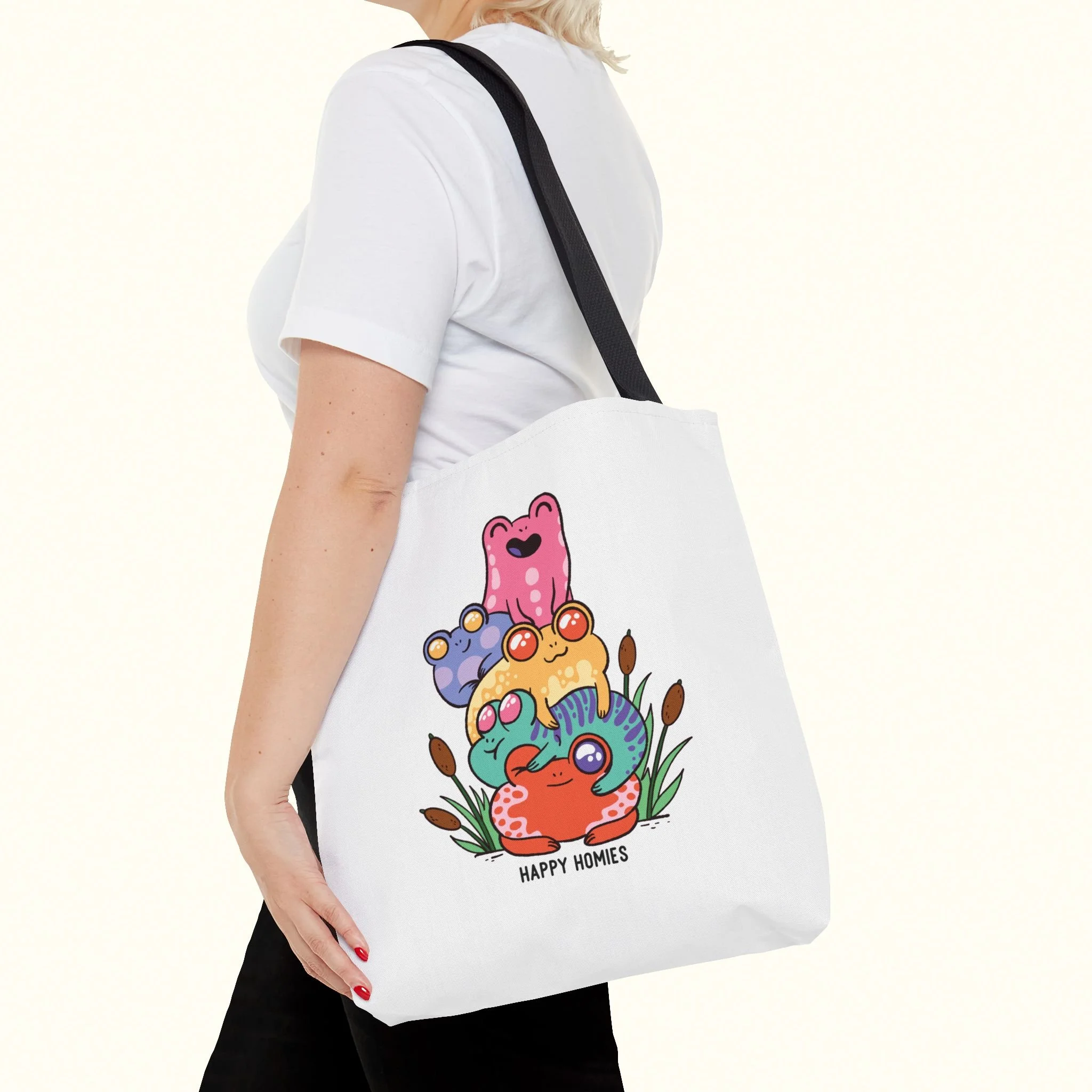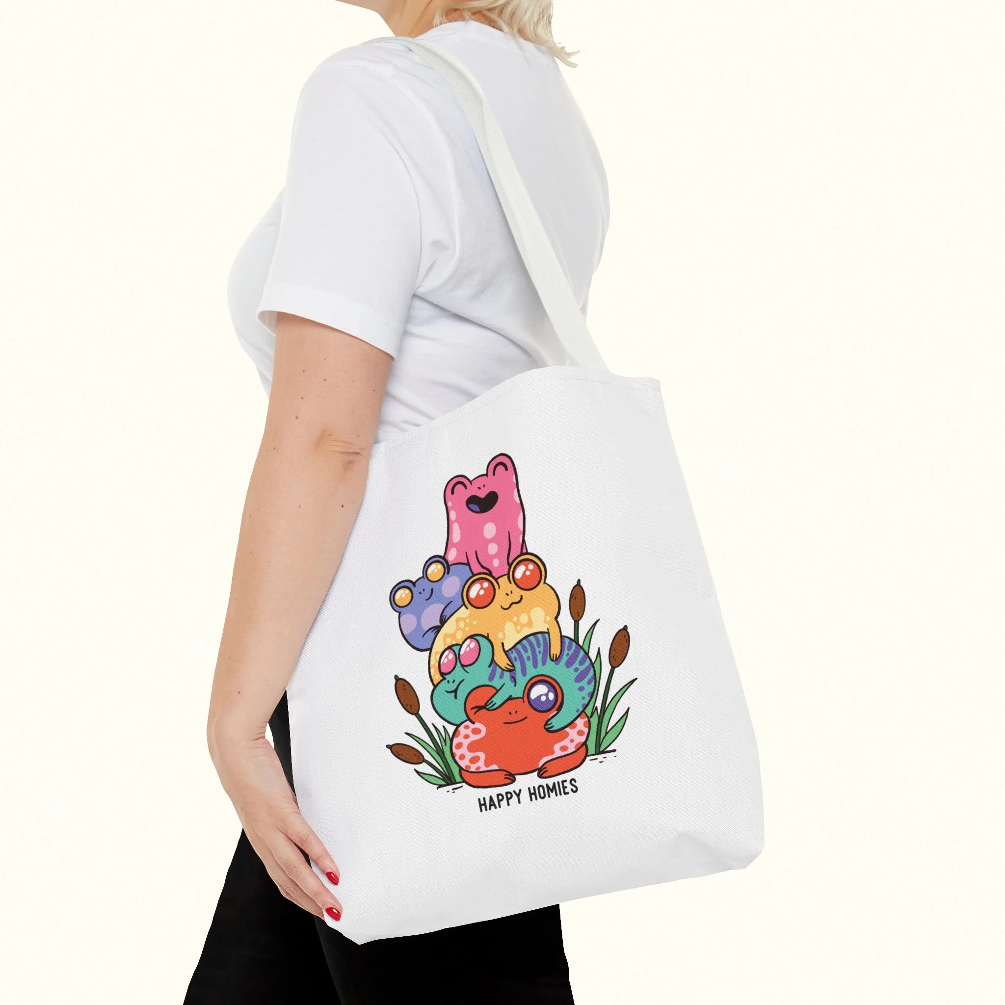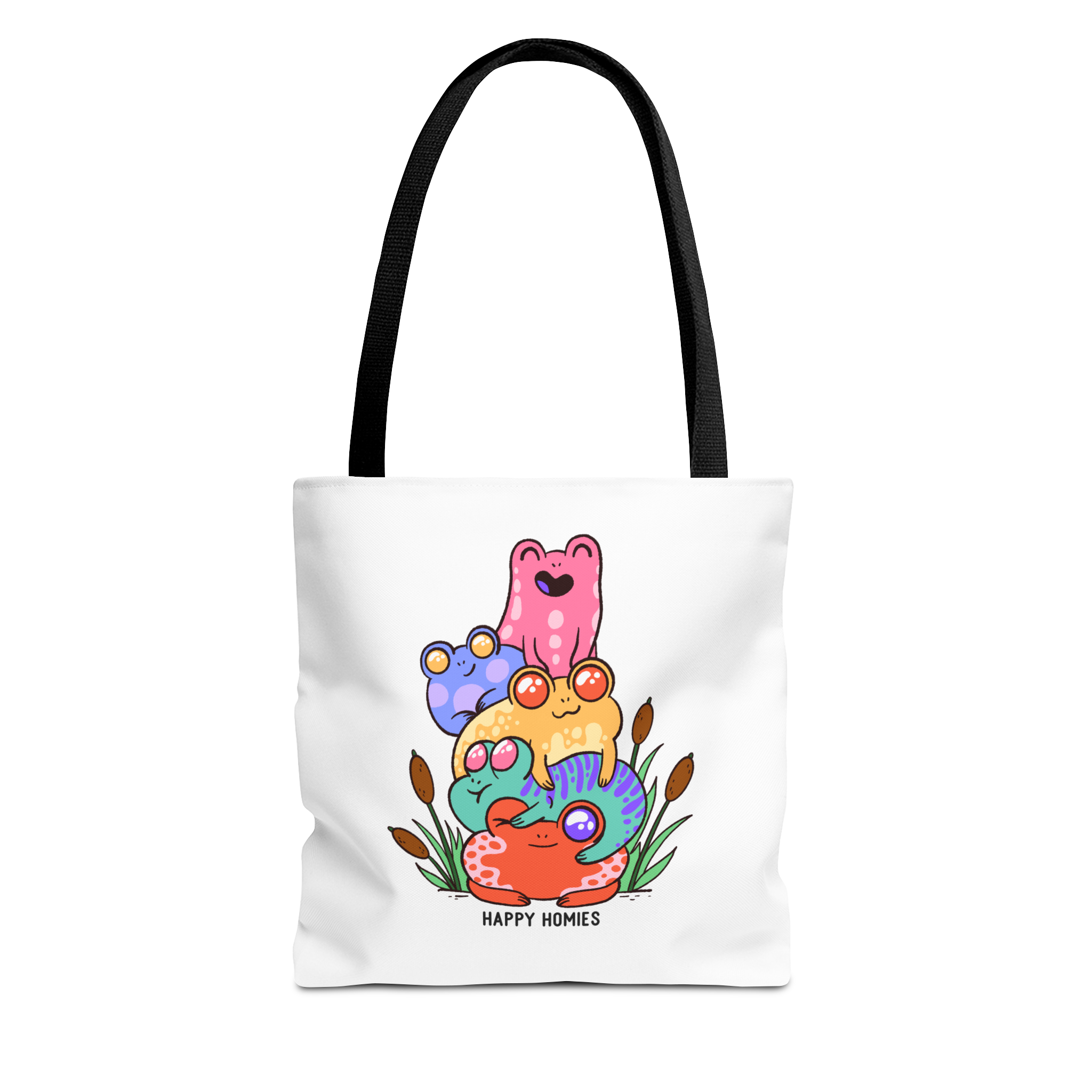 A cute froggy stack design and Happy Homies logo on a sturdy tote bag. Perfect for carrying groceries, books, or beach essentials, it seamlessly fits into the busy lifestyle of anyone looking to add a bit of fun to their errands.