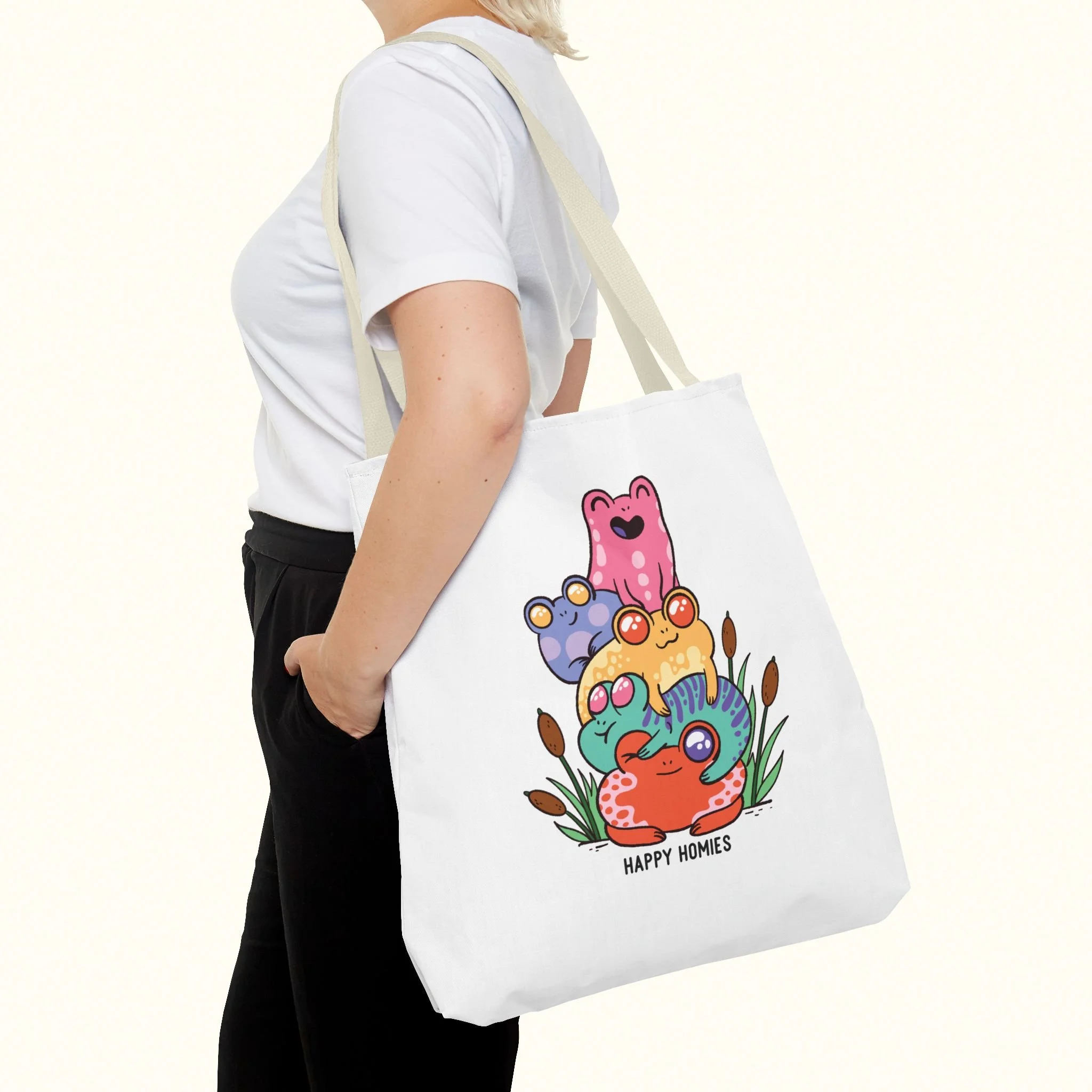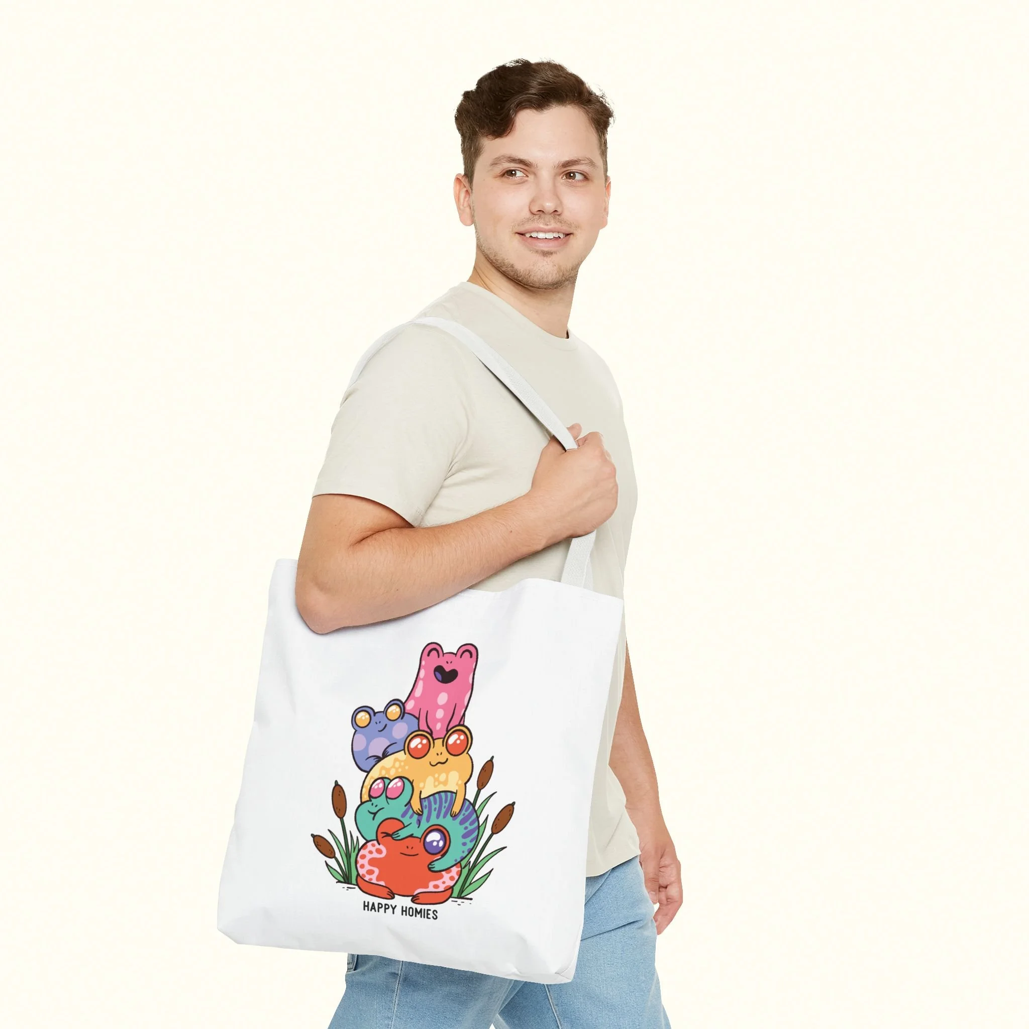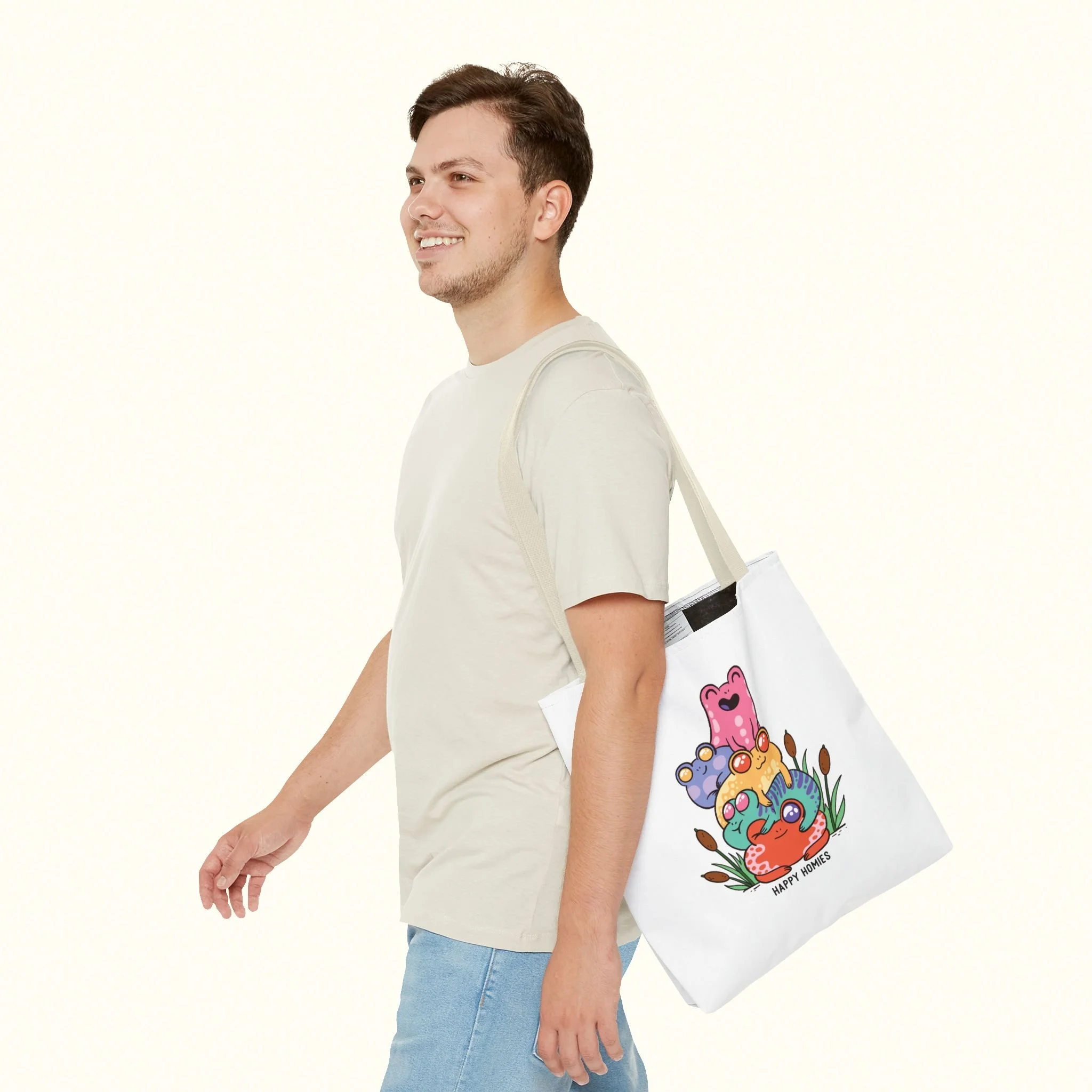 A cute froggy stack design and Happy Homies logo on a sturdy tote bag. Perfect for carrying groceries, books, or beach essentials, it seamlessly fits into the busy lifestyle of anyone looking to add a bit of fun to their errands.