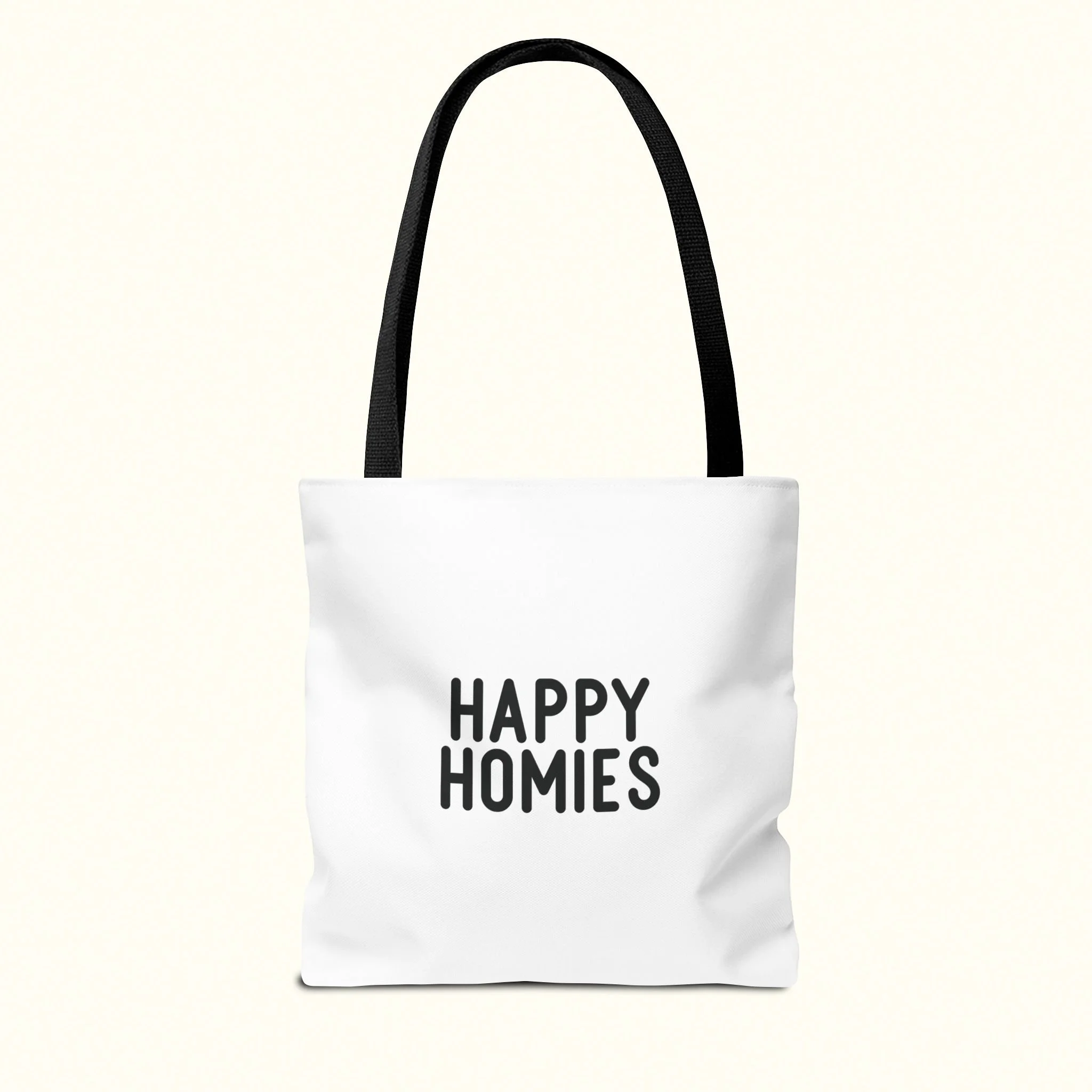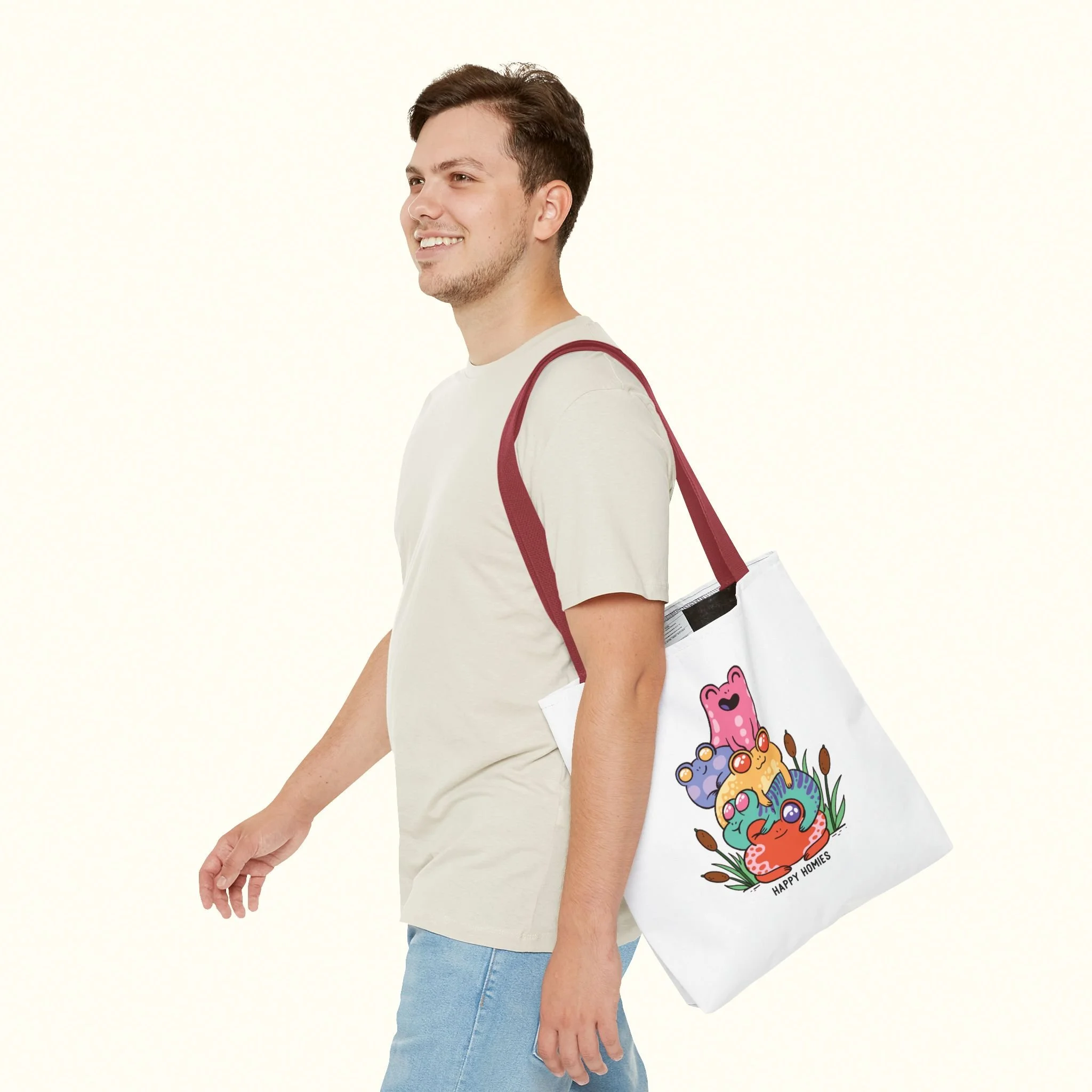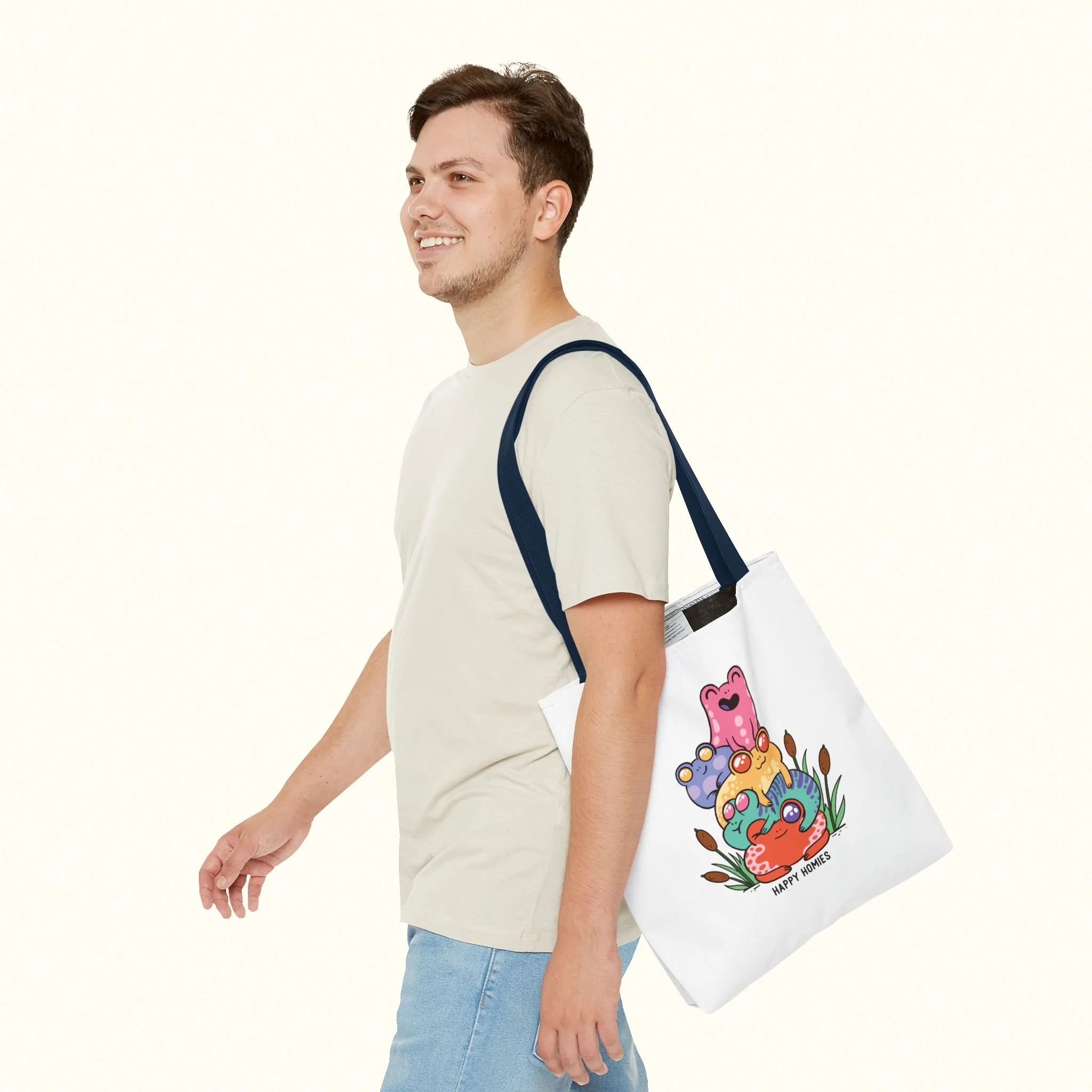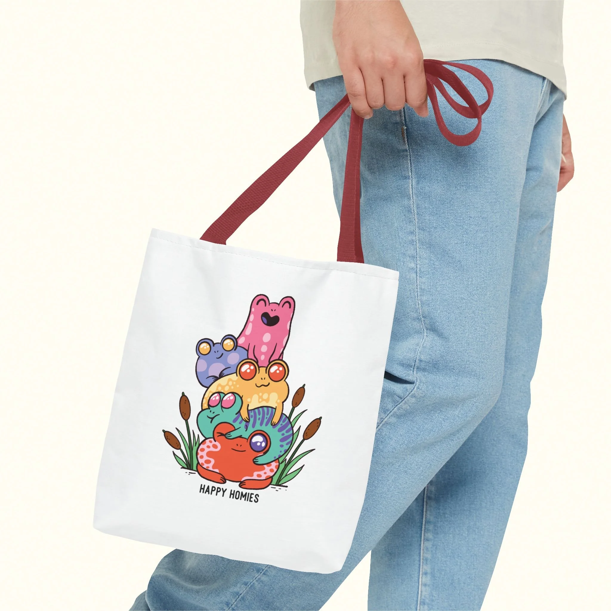 A cute froggy stack design and Happy Homies logo on a sturdy tote bag. Perfect for carrying groceries, books, or beach essentials, it seamlessly fits into the busy lifestyle of anyone looking to add a bit of fun to their errands.